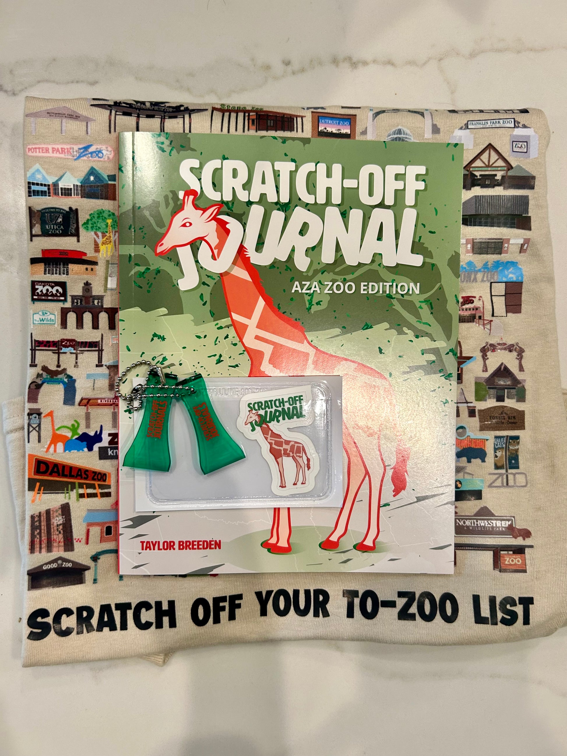 An AZA Zoo edition journal, with a matching Tee, a sticker, a pocket AND two scratcher tools